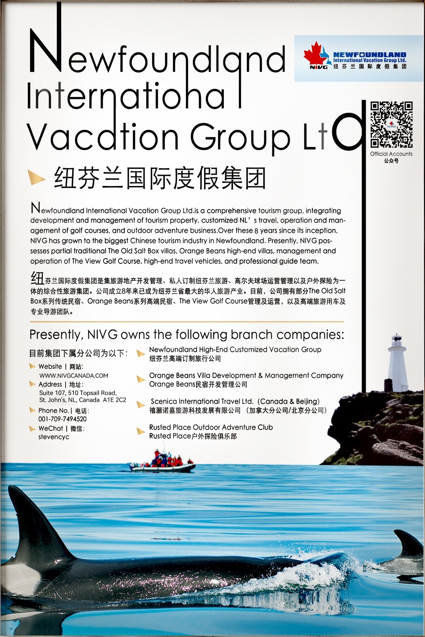 Newfoundland International Resort Group is a comprehensive tourism group integrating tourism real estate development management, private customized Newfoundland tourism, golf course operation management and outdoor exploration. The company is located in St. Johns, the beautiful capital city of Newfoundland. Since its establishment seven years ago, it has become the largest Chinese tourism industry in Newfoundland. It provides comprehensive solutions and royal standard services based on Newfoundland's rich tourism resources, such as travel scheme consultation, planning, formulation and implementation.