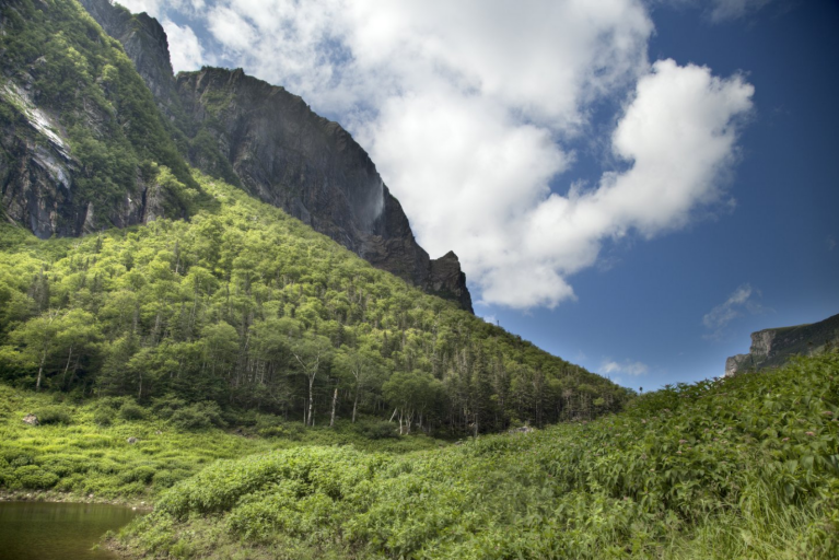Western Brook Pond“西溪峡湾”位于纽芬兰岛西海岸的格罗斯莫恩国家公园,是远古时期的冰川消融后形成的,已有数十亿年的历史。现在冰川早已消逝,而飞流直下的冰川水瀑布把融化的水再次灌入湖水内,形成了特别的峡湾。作为世界上最清澈的淡水湖,离子含量少到无法导电,湖泊长16公里,深165米,是大西洋鱼,布鲁克鱼和北极红点的栖息地,也是罕见的悬崖鸡栖息地。乘船缓缓飘过,可近距离看到壮观的冰川雕刻的内陆峡湾,冰川的作用雕凿出了壮丽的风景,有沿海低地,冰川山谷,陡峭的悬崖和飞珠溅玉的瀑布。湖边还有许多叫不上名的小花,微风轻吹,花儿随着湖面波光浅浅摇曳。