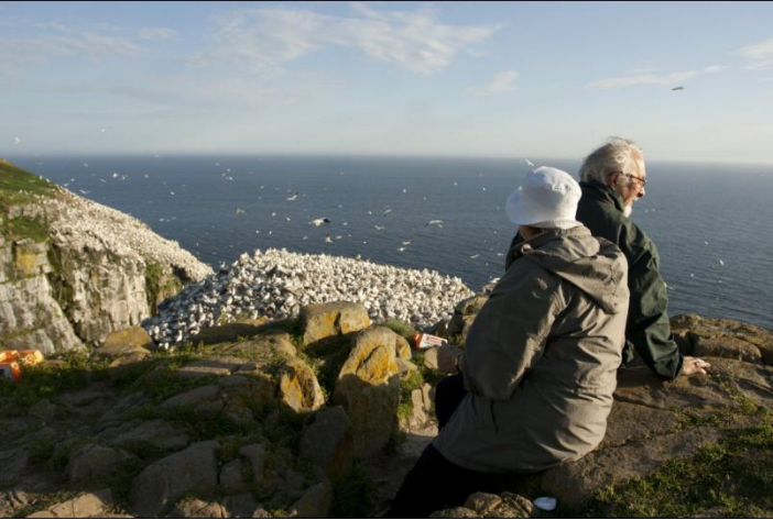圣玛丽鸟类自然保护区(Cape St. Mary's Ecological Reserve)俗称鸟岛,是北美最大的海鸟栖息和筑巢地。七万多只大鸟把整个小岛和周围的悬崖壁覆盖成了白色,在这个宛如仙境的海角,栖息着成千上万的海鹦/善知鸟(Puffin)、北方塘鹅(Gannett)、崖海鸠( Common Murre)、厚嘴海鸦(Thick-billed Murre)、黑腿三趾鸥(Black-legged Kittiwake)及海雀(Razorbill)、角百灵(Horned Lark)。为什么北方塘鹅被称作“多情鸟”呢?谜底将由您亲眼揭开:您将目睹北方塘鹅那真真正正奇特美丽的爱恋方式:雌鸟和雄鸟面对面地展开双翼,然后,不断地摇头,用喙互相摩擦,或者用喙彼此梳理羽毛。最后,雌鸟和雄鸟一起昂首,喙指向天空,不断鸣叫,好像在对其它同伴宣布“我们结成夫妻了!”。当地人把这一场面形象比喻为“击剑”(法语 l'escrime)。北方塘鹅则以它独特而著名的“击剑式接吻”,而获得“多情鸟”的荣誉称号。